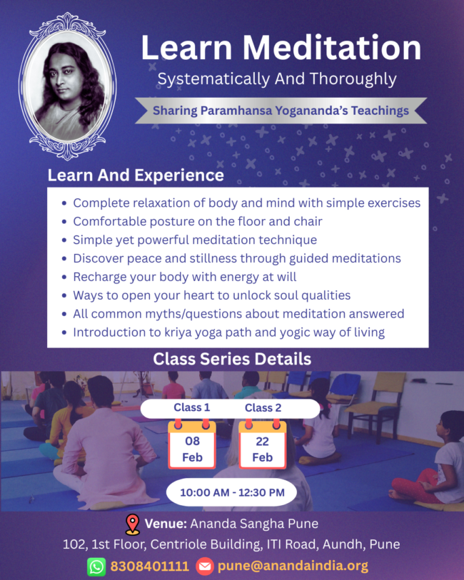Venue: Ananda Sangha Pune, 102, 1st floor, Centriole Building, ITI Road, Aundh, Pune.