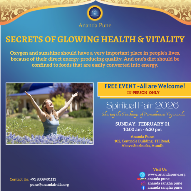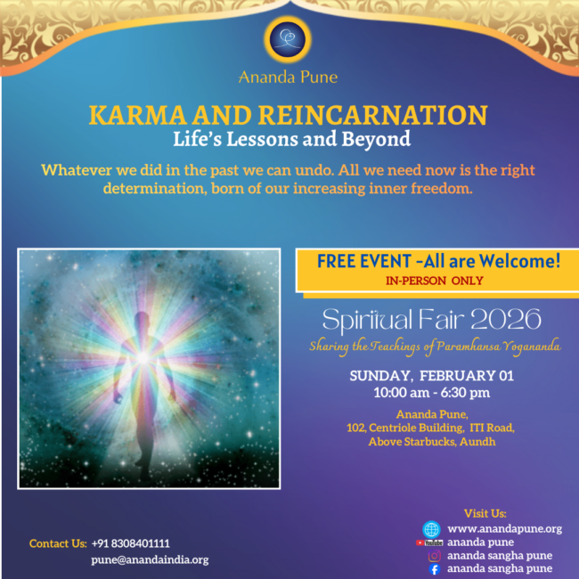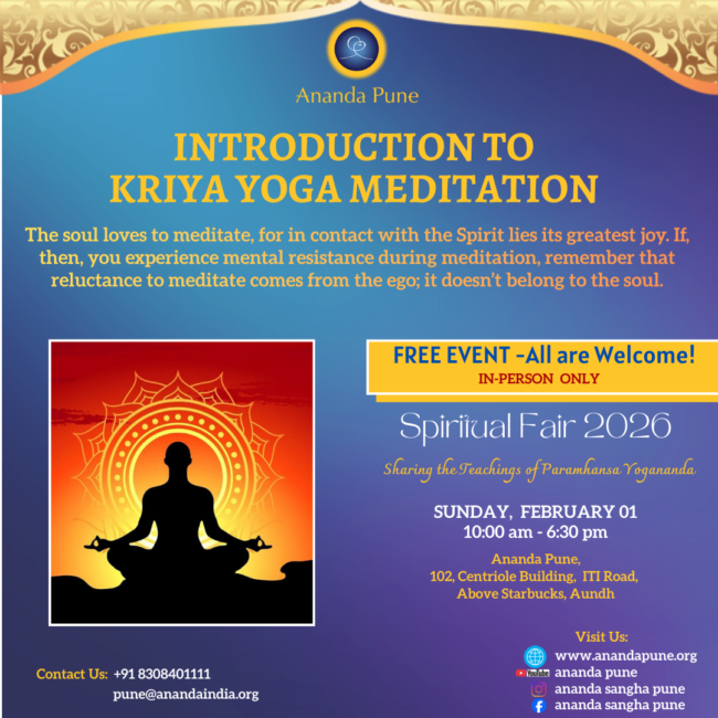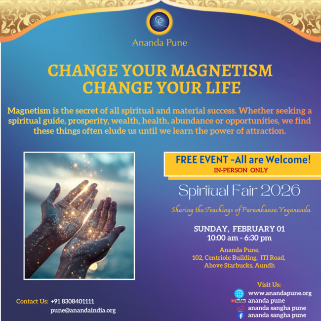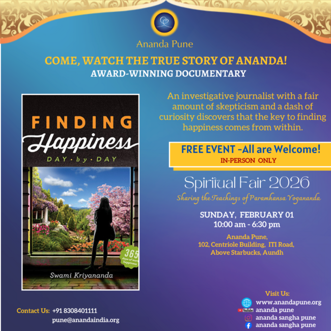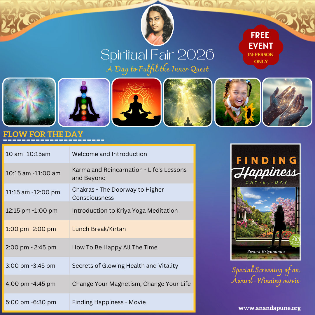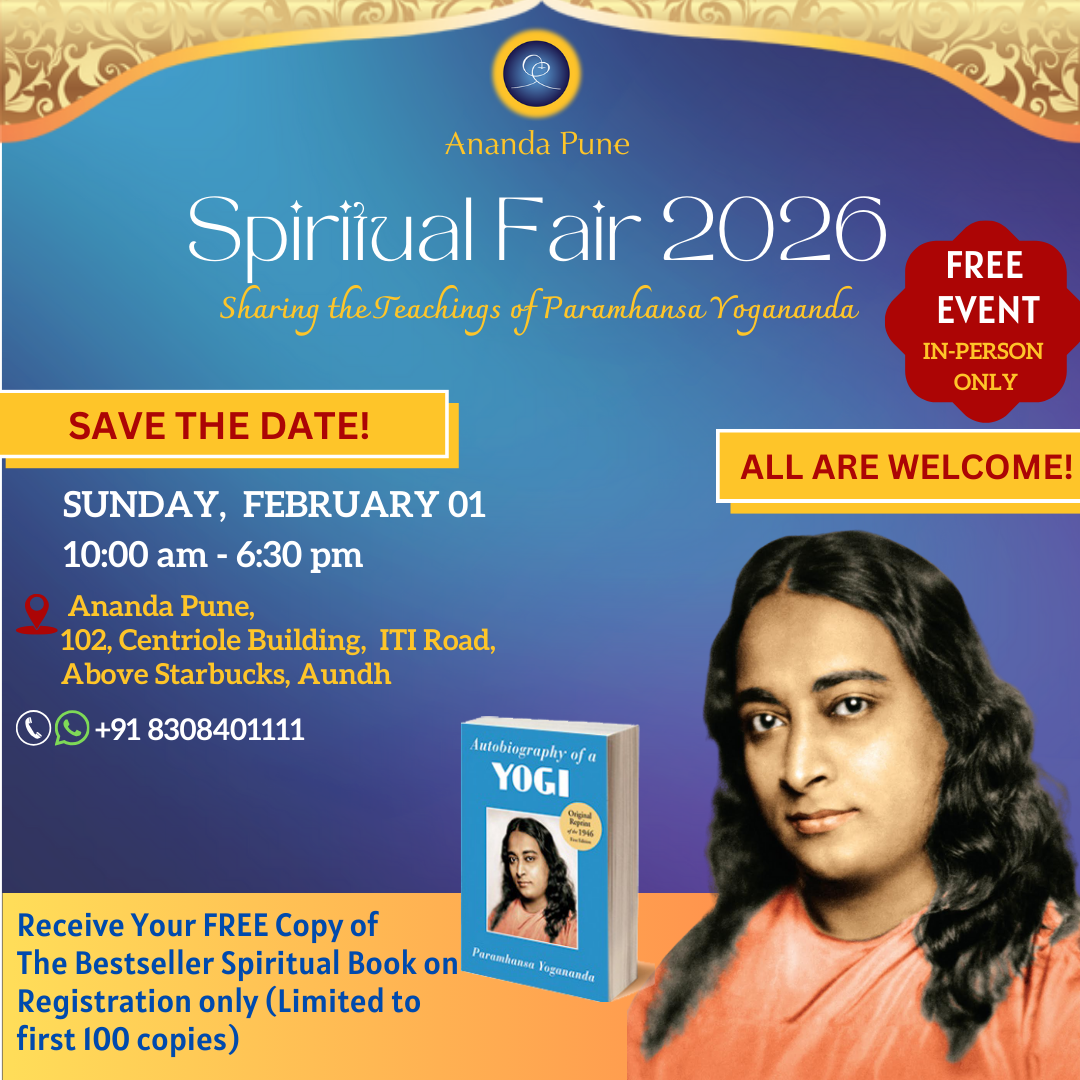 SPIRITUAL FAIR 2026 Sharing the Teachings of Paramhansa Yogananda This event is Free. Registration Required REGISTER HIGHLIGHTS REGISTER The event will be held at Ananda Sangha Pune. Address: 102 Centriole, ITI Road, Above Starbucks Cafe, Aundh